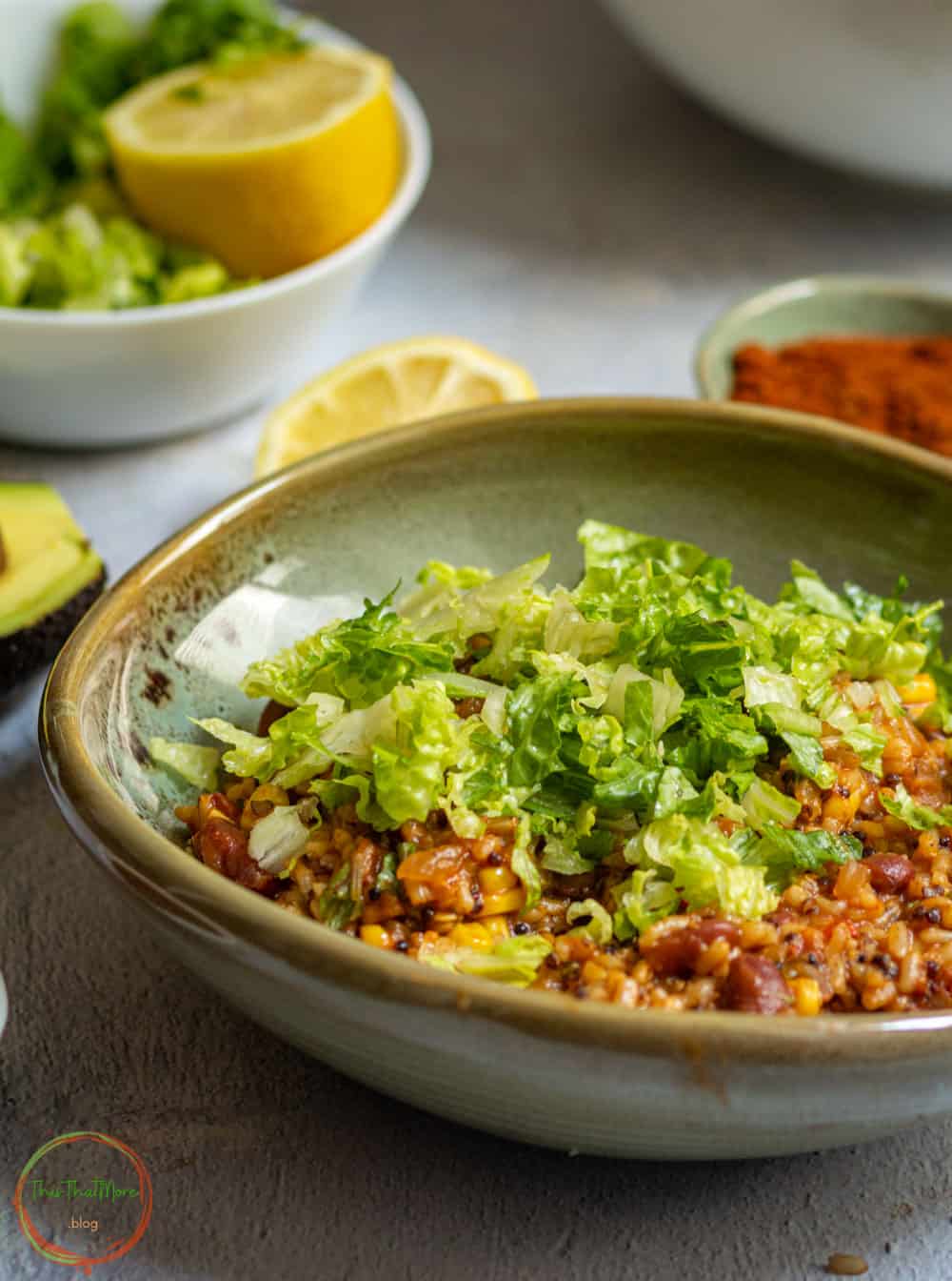 Vegan Burrito Bowl is a hearty meal that keeps you full for a longer time. For more healthier option you can use brown rice or quinoa.